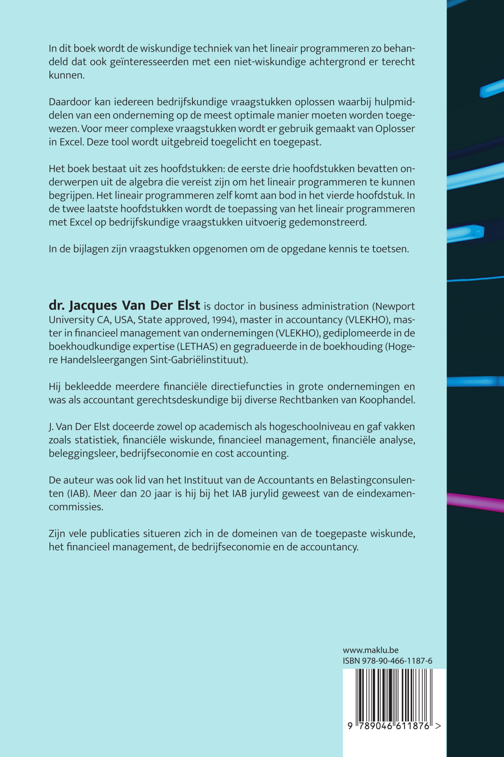 Het boek bestaat uit zes hoofdstukken: de eerste drie hoofdstukken bevatten onderwerpen uit de algebra die vereist zijn om het lineair programmeren te kunnen begrijpen. Het lineair programmeren zelf komt aan bod in het vierde hoofdstuk. In de twee laatste hoofdstukken wordt de toepassing van het lineair programmeren met Excel op bedrijfskundige vraagstukken uitvoerig gedemonstreerd.